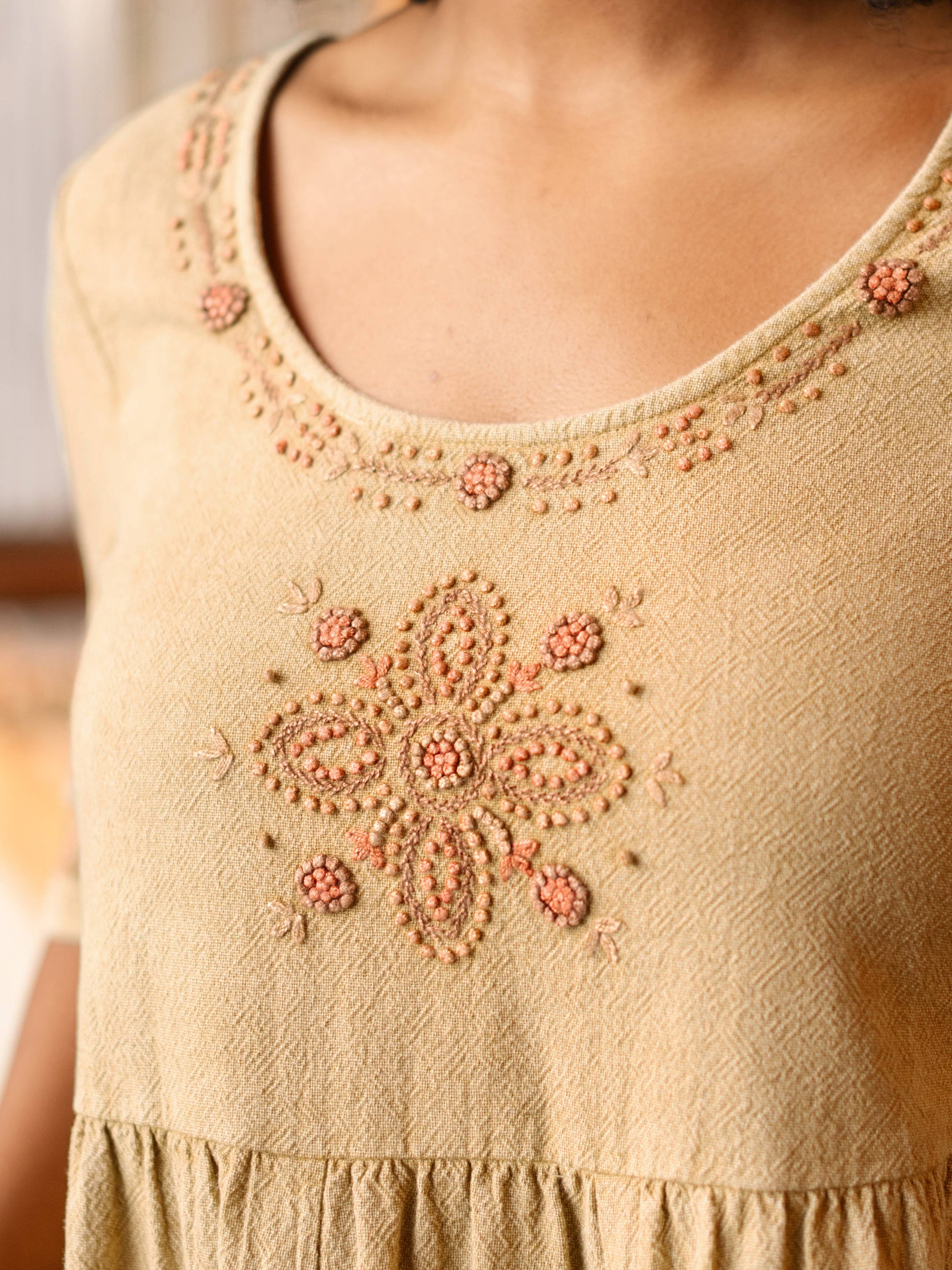 Runs large: Suggest sizing down: 100% Cotton | Sunwashed cotton hopsack | Side seam pockets | Exquisite french knot embroidery accents bodice, sleeves, and pockets | Light gathers at waist | Button tie back waist | Elbow length sleeves | Rachel is 5'7" and wearing a size small dress measuring 47" | Relaxed, A-line fit | Textile tip: The sunwash process creates variegated and uneven colors intentionally as part of its beauty. Colors may vary from piece to piece. | Machine wash, separately in cold water. Hang to dry. | Proudly Made in India